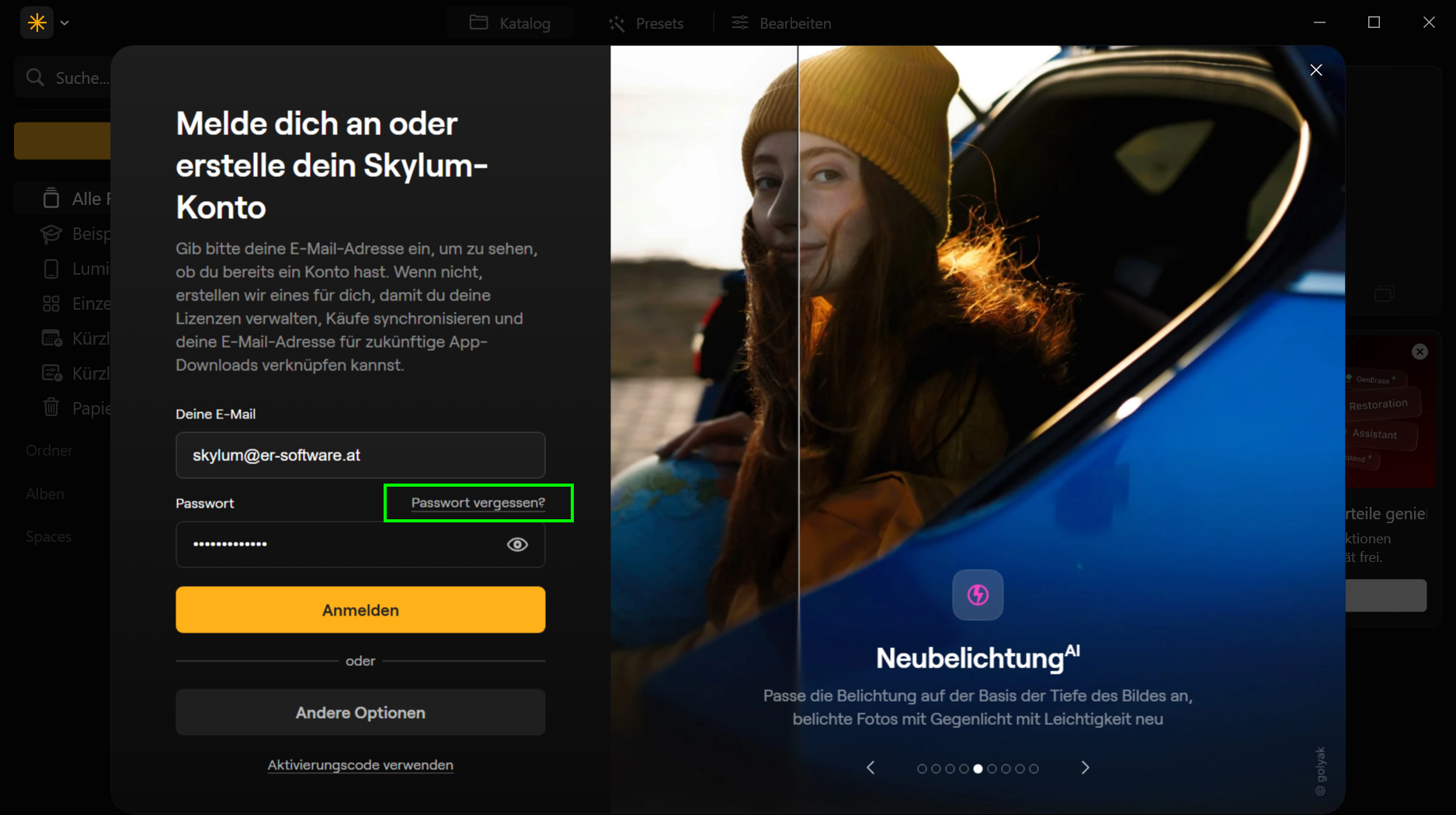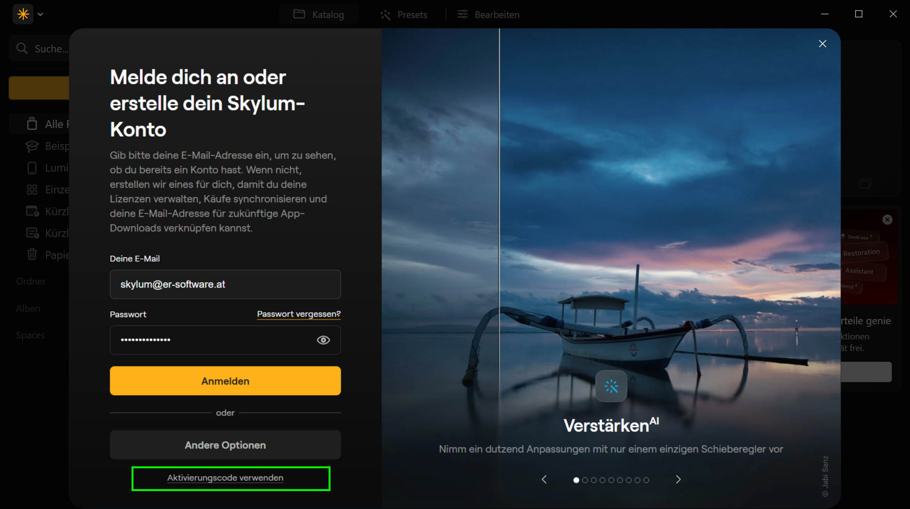 Bei weiteren Starts des Programms müssen Sie sich nur noch mit dieser E-Mail-Adresse (also Ihrem Skylum-Konto) und Ihrem Passwort anmelden. Den Aktivierungscode brauchen Sie NICHT mehr.