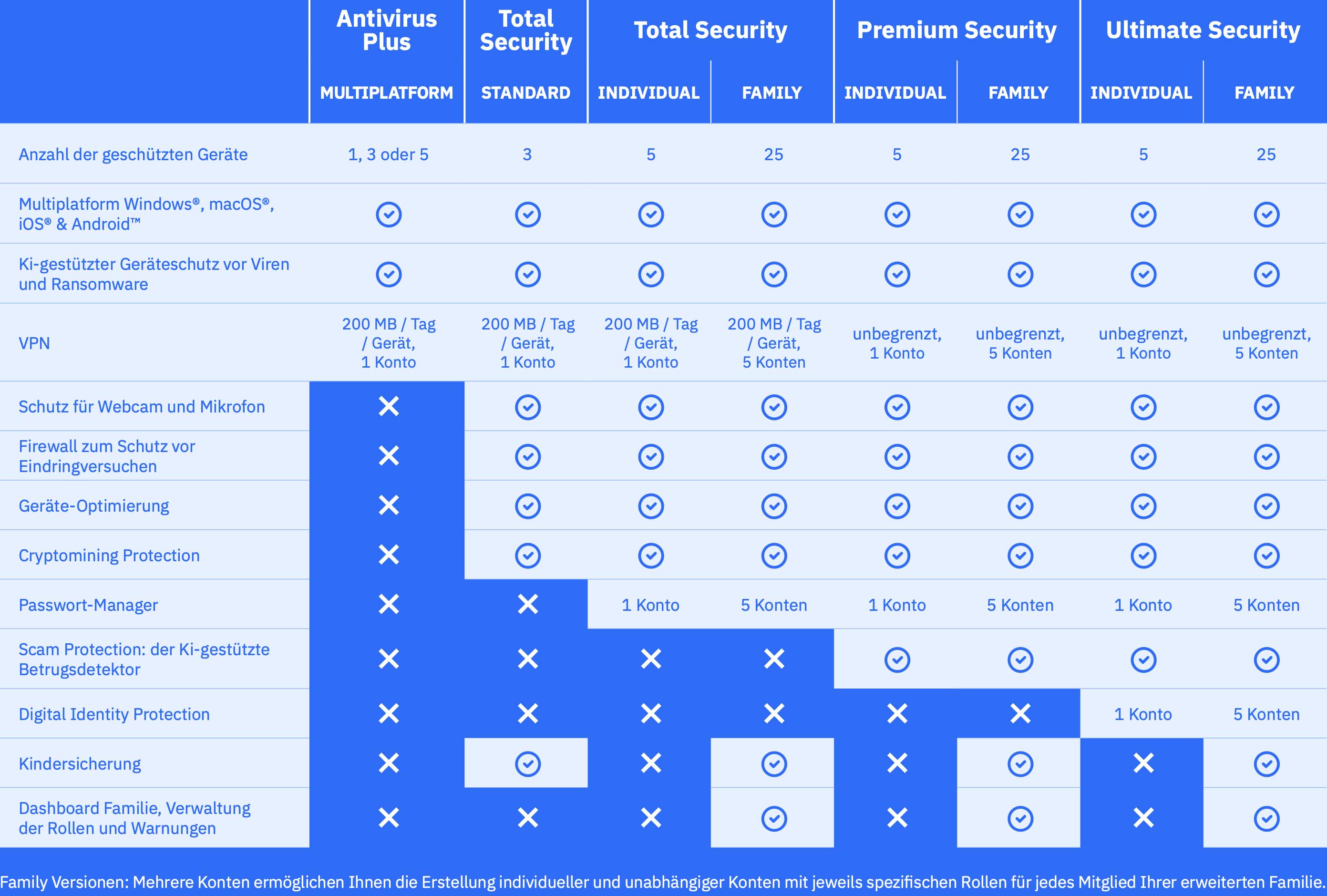 Die folgende Tabelle gibt einen Überblick über die Eigenschaften der verschiedenen Bitdefender-Produkte.
