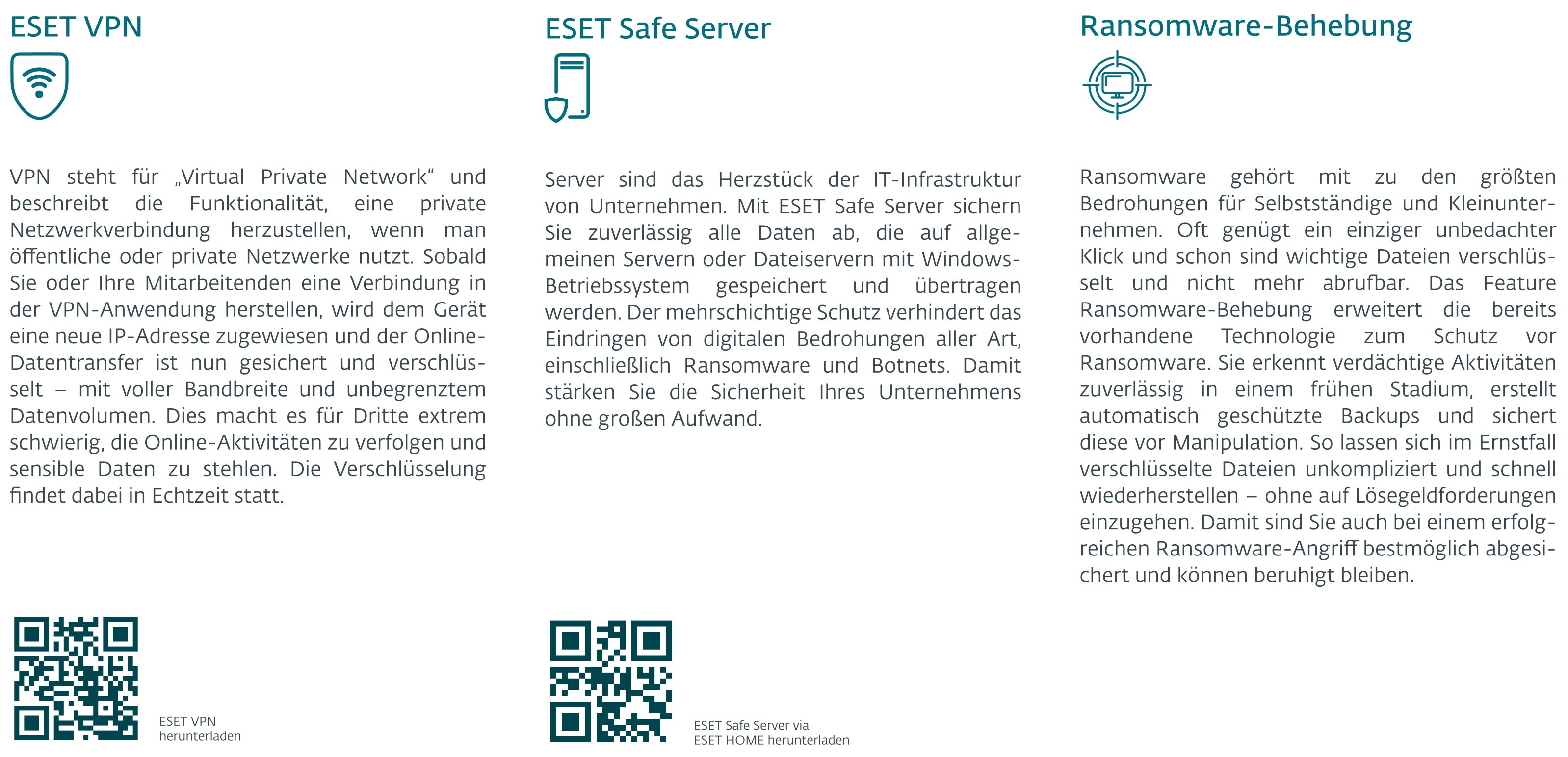 | Betriebssystem | Windows 11 oder Windows 10; Windows Server 2019 oder höher; macOS 11 (Big Sur) oder höher; Android 9.0 oder höher; iOS 16.6 oder höher (für ESET Home App), iOS 12.0 oder höher (für ESET VPN App) | ||||