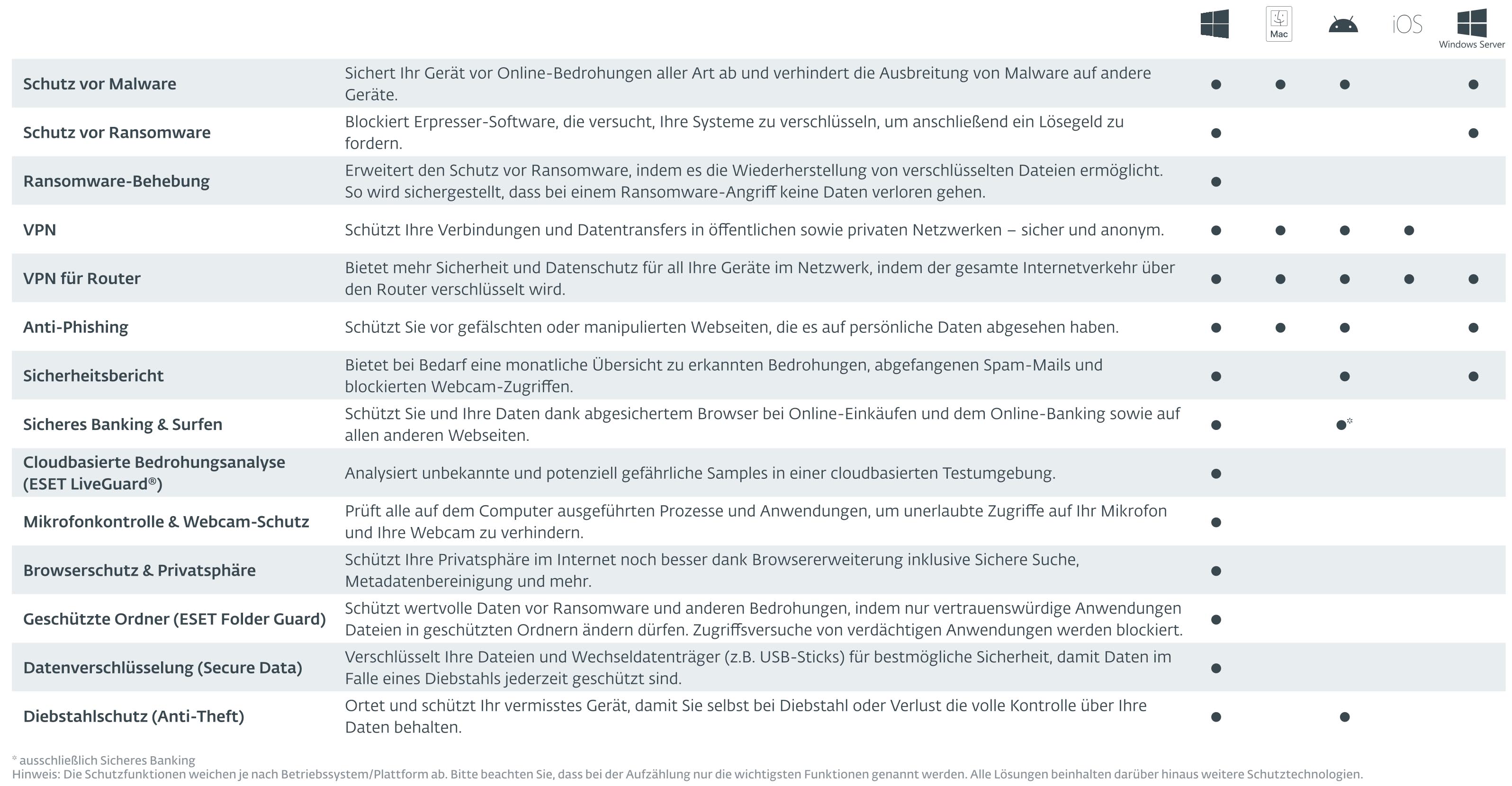 Mit dieser Lizenz erhalten Sie Zugriff auf ein umfassendes Sicherheits-Ökosystem. Die folgende Tabelle gibt Ihnen einen Überblick über die Kernfunktionen und die unterstützten Plattformen: